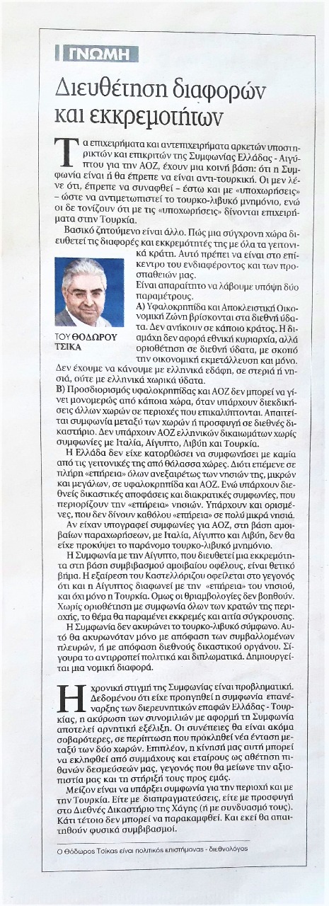 Στη συμφωνία με την Ιταλία, η Ελλάδα ορθώς αποδέχτηκε ότι τα Διαπόντια νησιά (Οθωνοί κ.λπ., βορείως της Κέρκυρας) και οι Στροφάδες (νοτίως της Ζακύνθου) στο Ιόνιο, επειδή είναι πολύ μικρά νησιά, δεν έχουν πλήρη επήρεια στην Αποκλειστική Οικονομική Ζώνη. Στην τμηματική συμφωνία με την Αίγυπτο, η χώρα μας κινούμενη επίσης με ρεαλισμό συμφώνησε σε μηδενική επήρεια δύο πολύ μικρών ελληνικών νησιών στα νότια του Λασιθίου της Κρήτης. Δεν μπορεί παρά να εφαρμόσει τα ίδια κριτήρια και στις υπόλοιπες συζητήσεις με την Αίγυπτο, αλλά και με την Αλβανία, τη Λιβύη και την Τουρκία. Αν δεν το κάνει, θα γίνει καταγέλαστη διεθνώς.