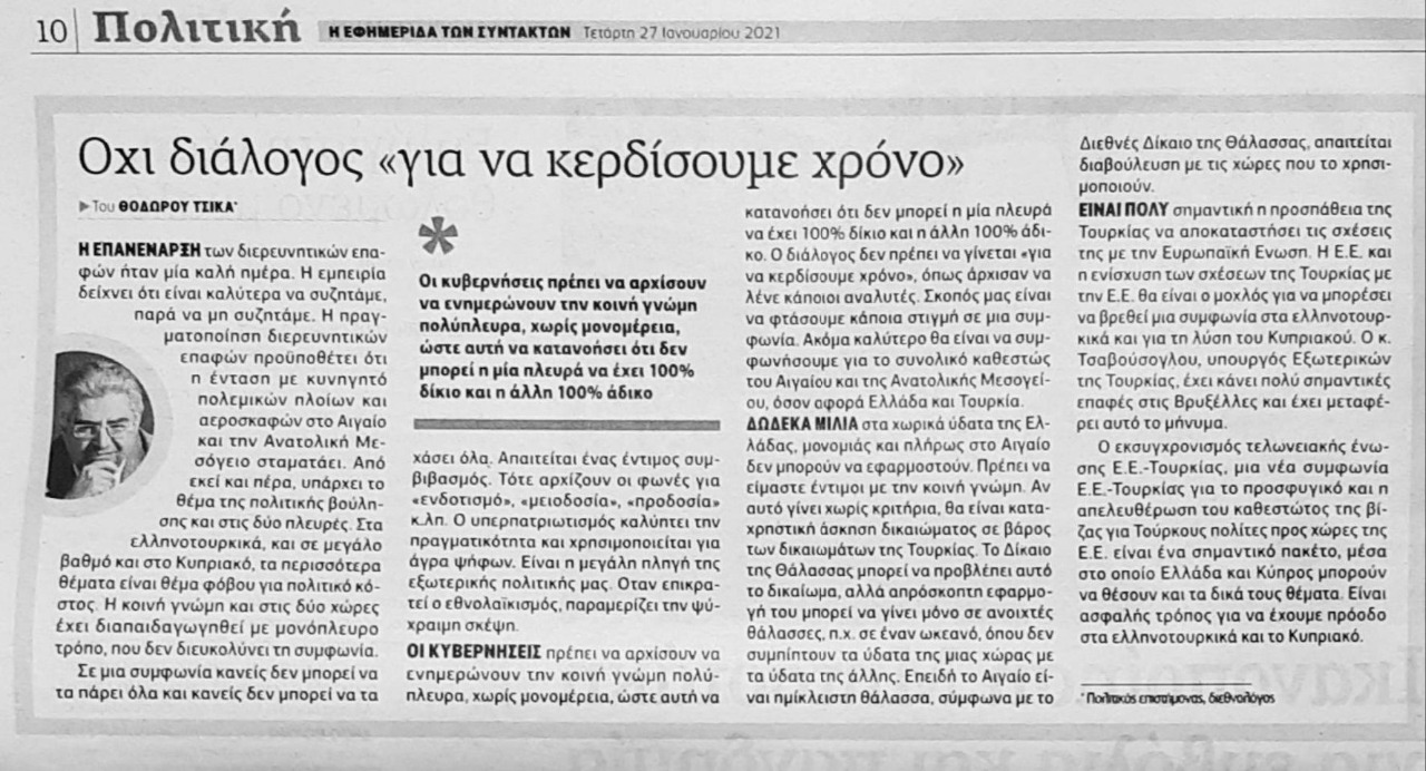 Η Ελλάδα και η Τουρκία θα είναι γείτονες, στους αιώνες των αιώνων. Ούτε αυτοί, ούτε εμείς μπορούμε να μετακομίσουμε σε άλλα σημεία της Γης. Ο κίνδυνος ενός θερμού επεισοδίου για τα διεθνή ύδατα(!) καλό είναι να αμβλύνει τα πάθη που τροφοδοτούν εθνικισμούς και μισαλλοδοξίες, δυσκολεύοντας τις διαπραγματεύσεις για την επίλυση των διαφορών μεταξύ των δύο χωρών.