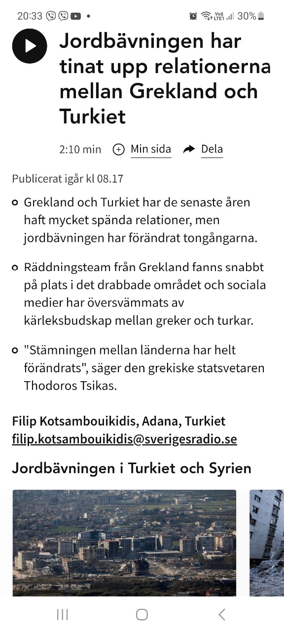 Το Κρατικό Ραδιόφωνο της Σουηδίας/ Sveriges Radio, με τον δημοσιογράφο Filip Kotsambouikidis, πραγματοποίησε αποστολή στις πληγείσες από τους σεισμούς περιοχές της Τουρκίας. Εκεί είδε τις αντιδράσεις των πολιτών και για την ελληνική βοήθεια.