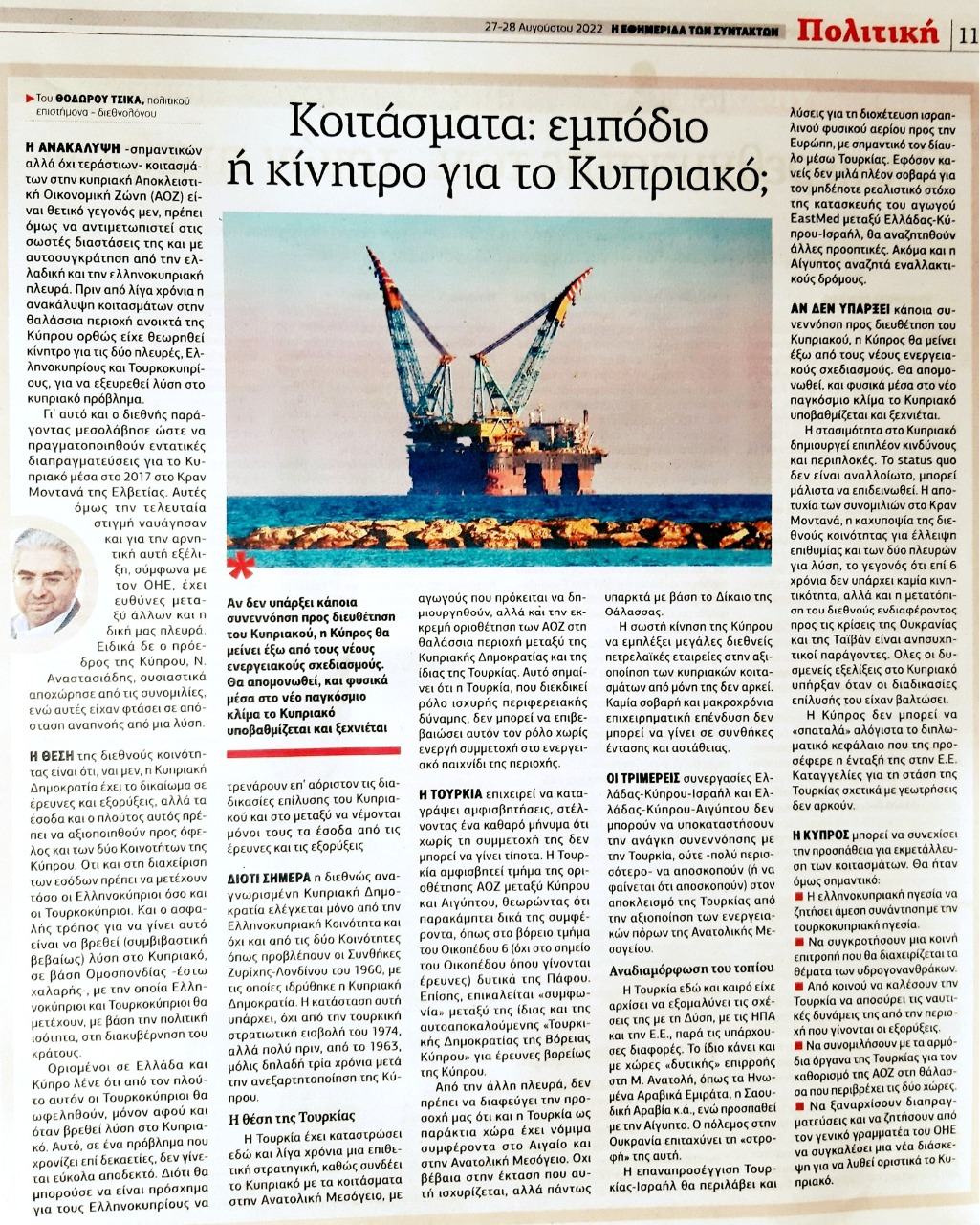 "Κοιτάσματα: εμπόδιο ή κίνητρο για το Κυπριακό; " - ΑΡΘΡΟ στην "Η Εφημερίδα των Συντακτών" ΣΑΒΒΑΤΟΚΥΡΙΑΚΟ