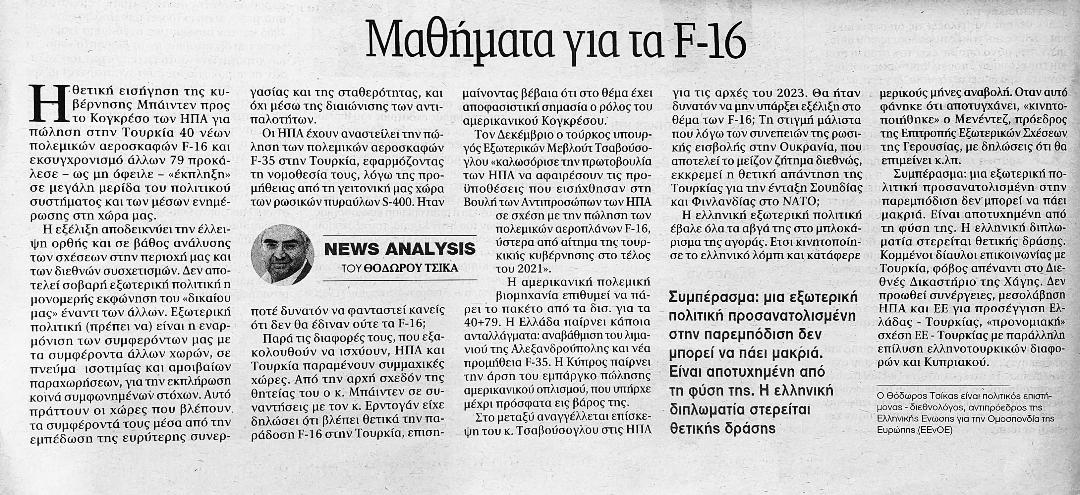 Μαθήματα για τα F-16 / ΑΡΘΡΟ ΣΤHN ΕΦΗΜΕΡΙΔΑ "ΤΑ ΝΕΑ"