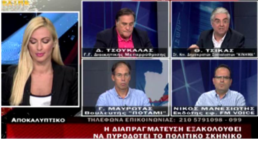 Στο δελτίο ειδήσεων EXTRA για διαπραγματεύσεις με Τρόϊκα, νέο Μνημόνιο, Δημ.Διοίκηση: Θόδωρος Τσίκας-ΚΙΝΗΜΑ Δημοκρατών Σοσιαλιστών, Δημήτρης Τσουκαλάς-Γενικός Γραμματέας Διοικητικής Μεταρρύθμισης/ΣΥΡΙΖΑ, Γιώργος Μαυρωτάς-βουλευτής "Το ΠΟΤΑΜΙ" (31/7/15